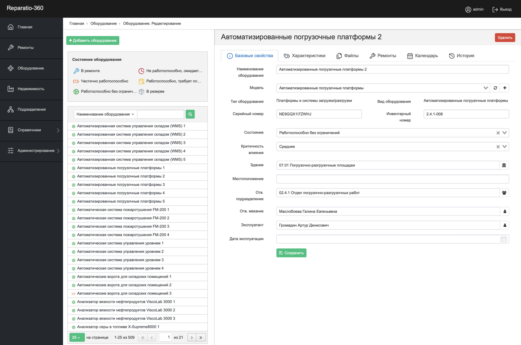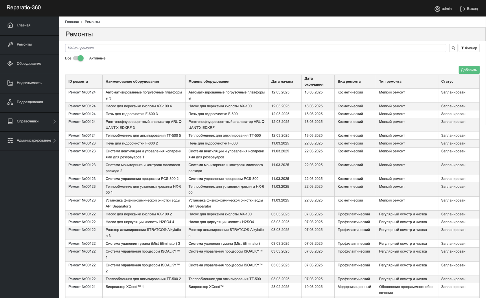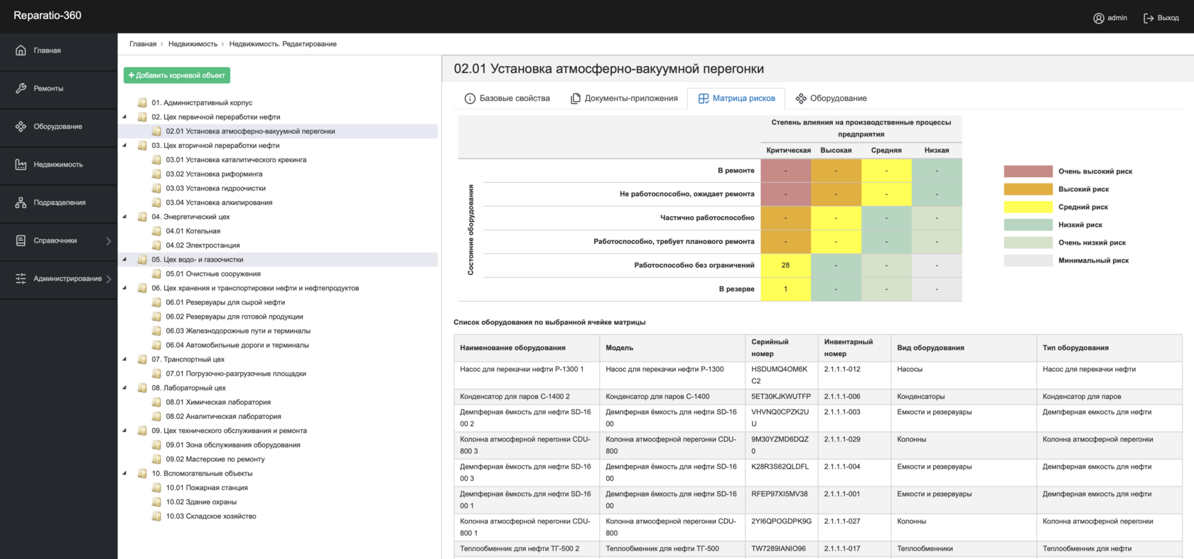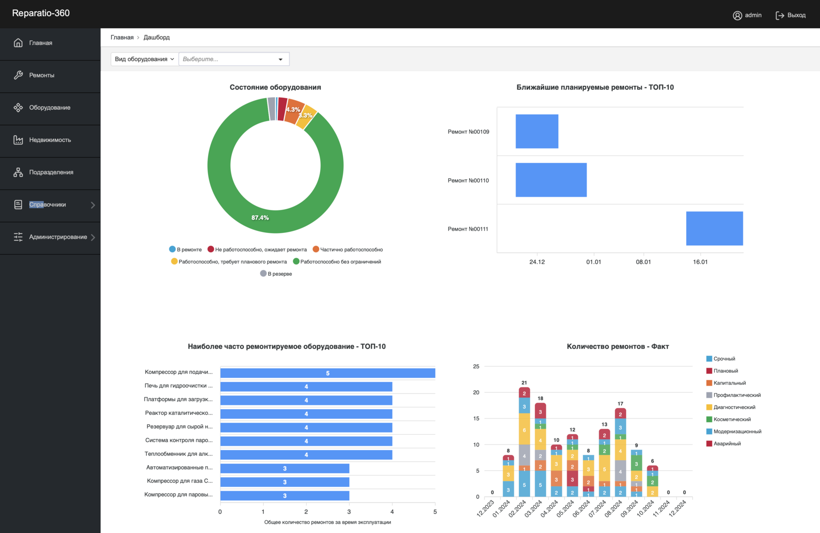 Reparatio360 обеспечивает централизованное хранение данных об оборудовании, запланированных и выполненных ремонтных мероприятиях, а также связанную документацию. Система предоставляет пользователям удобные инструменты для анализа информации, формирования отчётов и мониторинга текущего состояния объектов, что позволяет эффективно планировать мероприятия и минимизировать риски простоев.
